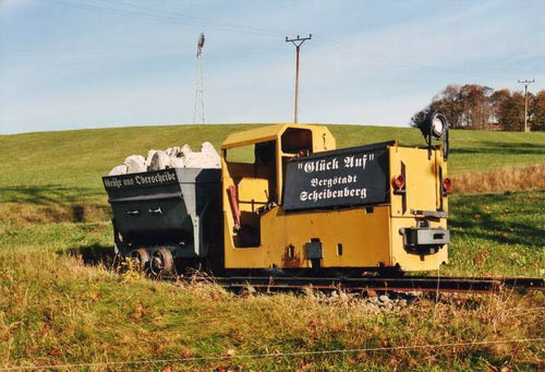 13.04.1999/ jm/ Am Ortsausgang Richtung Scheibenberg steht zusammen mit zwei Grubenwagen eine BBA-Grubenlok. Einer der Wagen trägt die Beschriftung "Mit diesem Hunten endet der Uranerzbergbau in Pöhla - 28.06.1991".