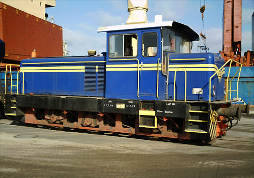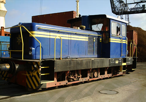 17.03.2004/ uv/ Auch hier gibt es noch eine Lokomotive, die in Pausenzeiten im Freien hinter einer Halle mitten im Werksgelände steht. Die Lok ist auf der Ostseite des Hüttenhafens im Einsatz. Sie verkehrt zwar nicht täglich, hat dann aber doch wieder viel zu tun: Für den Nachmittag des Stichtages wurde z.B. ein 48-Wagen-Zug erwartet. Das Ladegut sind hauptsächlich Stahlerzeugnisse, obwohl auf dem Betriebsgelände alle möglichen Materialien (Steine, Torf, ...) umgeschlagen werden.
