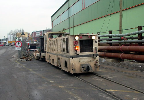 04.02.2007/ stw/ U-Bahn-Baustelle an der Bonner Straße: Auf dem Gelände des ehemaligen DB-Stückgutbahnhofs, südlich des Güterbahnhofs Bonntor, hatte man bereits im letzten Jahr eine Umschlaganlage für den Aushub der zu bauenden Tunnelröhre erichtet. Die zweigleisige Zufahrt zur Tunnelbaustelle war mittels Schranke für die Schienenfahrzeuge gesperrt. Lok "TL 02" hatte zwei Wagen mit Röhren bis an die Rampe gebracht, scheinbar wurden diese an diesem Sonntag noch verlegt, es herschte reges Treiben um Rand der Rampe. Auf dem Gelände waren noch vier weitere Lokomotiven zu sehen, darunter auch die zwei neuen "TL 09" und "TL 10".