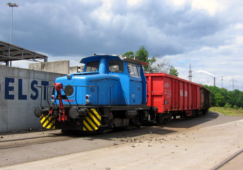 07.06.2005/ jm/ Nach Fragen im Büro durfte die Lok fotografiert werden - sie ist allerdings auch von Aussen über den Zaun zu sehen. Die kleine Maschine wird derzeit nicht eingesetzt, per Bahn wird aber weiterhin Schrott verladen (ca. 1000 Wagen im Jahr, also 4-5 pro Tag).
