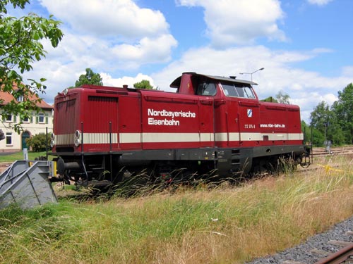 07.06.2005/ jm/ Neben der Hafenbahn gibt es im Hafen auch die Nordbayerische Eisenbahn NEB. Angetroffen wurde die 212 375, die nach Fragen bei der Hafenverwaltung (=> die schickt einen dann zum Betriebsleiter, und der sagt dann ja) abgelichtet werden durfte. Neben der 212er stehen bei der Hafenbahn zwei nicht weiter identifizierbare LEW V60D in den NEB-Farben, mit NEB-Schriftzug und DYWIDAG-Logo. Diese beiden Maschinen werden nach Algerien verschifft, wobei eine Einsatzlok ist und die zweite als Reserve und ggf. Ersatzteilspender dient.