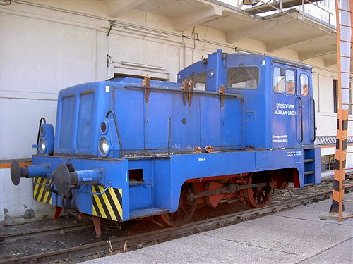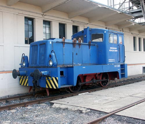 12.06.2003/ er/ Auf dem Anschluß der Dresdener Mühlen GmbH wurde die vorhandene Werklok in einen sehr guten Zustand vorgefunden, laut Anschriften letzte Rev im Jahr 2000 in Tharandt. Diese Lok scheint dieses Jahr schon bewegt worden sein, erkennbar an den angefahren Gleisstücken. Die gesamte Gleisanlage macht einen sehr gepflegten und ordentlichen Eindruck, jedoch hat offenbar im Jahr 2003 noch keine Zuführung stattgefunden, denn direkt an der Anschlußbahngrenze befindet sich eine Sh2 Scheibe.