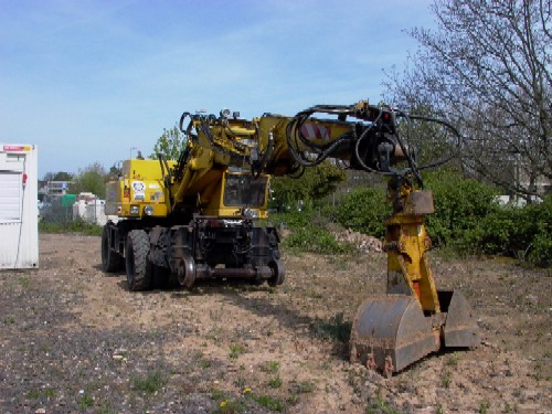 27.04.2008-info/ pz/ Ein Zweiwegebagger dieser Niederlassung wurde am 27.04.2008 auf der Baustelle des Bahnhofes Pulheim angetroffen. Es handelt sich um eine Atlas Typ 1304 K Zw-WB. Der Bagger ist bei der DB mit der Nr. 97 51 61 566 60-2 registriert.