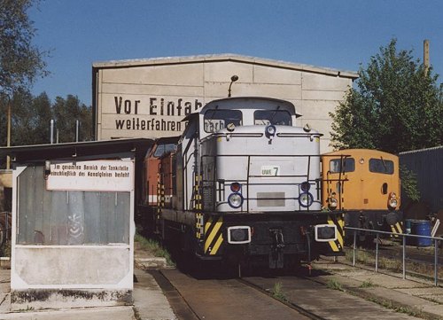 01.05.2003-info/ jm/ Bei der blauen, unbekannten V18B handelt sich definitiv um eine ehemalige DR-Lok im orangen Farbkleid, sie wurde bei der DWU gründlich neu in blau lackiert. In den Stangen beidseitig eingeschlagen ist die Nummer V 15 2034 (die spätere 311 613). Es handelt sich aber um die 101 563 (Beschriftung am Tank).
