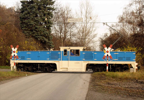 15.06.2004/ cp/ Das Solvay Werk Bernburg glänzt nicht nur durch seine Schmalspurbahn, die Vorderseite des Werkes ist nicht minder interessant. An einem Bahnübergang über die B 185 direkt neben dem der DB Strecke kommen die Gleisanlagen aus dem oberen und dem unterem Werkteil zusammen. An der Ladestraße des Bahnhofes Bernburg befindet sich die Wagenübergabestelle zur DB, so daß die Werklok regelmäßig raus kommt. Der Verkehr auf der Werkbahn wird von einem netten Stellwerk aus koordiniert. Einsatzlok war heute morgen die Lok 1.