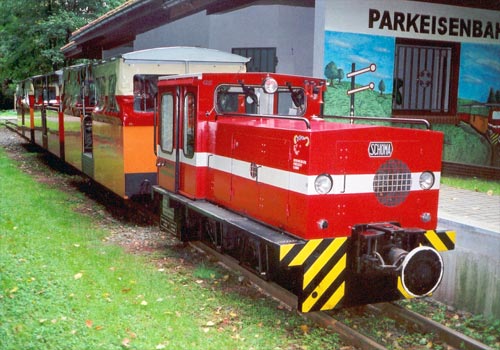 03.10.2005/ hg/ Die Parkbahn fährt, Einsatzlok war heute die Schöma FNr. 5493/1997. Ersatzlok ist die BND 30 FNr. 2593/1972, die im Schuppen abgestellt war. Auch noch vorhanden (lt. Lokführer), aber nicht betriebsfähig ist die zweite BND FNr. 2737/1969. Laut Quelle eine BND 45 die aus verschiedenen Teilen anderer Loks entstand. Ich hab sie selber aber nicht gesehen.