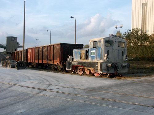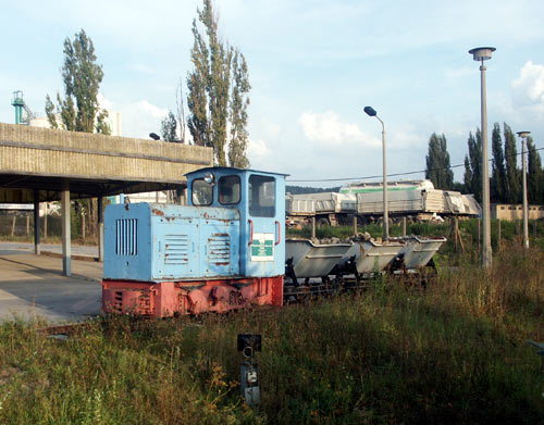 11.09.2004/ jm/ Trotz Samstag abend konnte hier noch Rangierverkehr beobachtet werden. Die Nr. 1, eine mit Caterpillar-Motor umgerüstete V22B, rangierte die Wagen an der Verladeanlage. Die Lok kam erst vor kurzem zurück von der HU. Eine zweite Lok soll laut Lokführer im Schuppen (heute unzugänglich) als Reserve stehen, es dürfte sich um die ebenfalls 1996 hier noch vorhandene V18B handeln. Die anderen Maschinen, darunter zwei Kaluga, sind nicht mehr vorhanden.