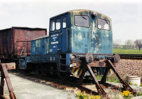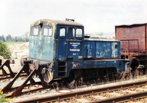 .03.2003/ rm/ Zuerst wurde die V60D eingesetzt, die von der Werkbahn der Lederfabrik Hirschberg stammte. Später erledigte dann die ehemalige Reichsbahn-V60D den Verschub. Nachdem beide Loks wegen Motorschaden abgestellt werden mußten, wird der Unimog eingesetzt. Die beiden V60D sollen demnächst verschrottet werden.