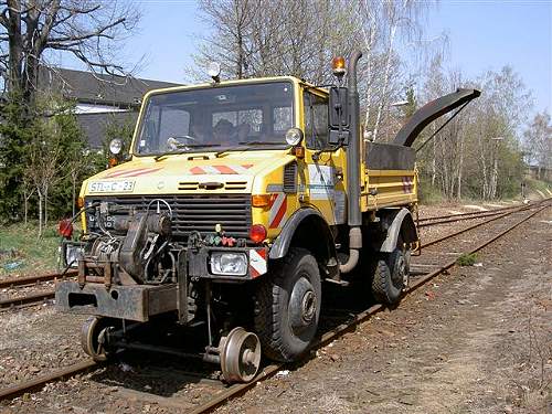 A. Richter GmbH: Im Bahnhof Brand-Erbisdorf wartet der Zweiwege-Unimog auf den nächsten Einsatz. (Foto: Erik Rauner)