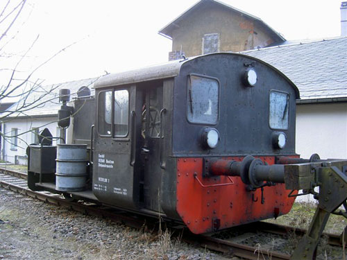 30.03.2004/ er/ 12.01.2005 / sh/ Auf dem Bahnhof Wolkenstein (Sachsen) ist eine Köf und eine Feldbahnlok vorhanden. Ebenfalls beim Zughotel Wolkenstein ist der Wagen 01-117 ex Waldeisenbahn Muskau vorhanden.