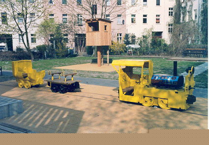 29.10.2002-info/ hg/ Seit Mai 2002 gibt es hier den Spielplatz mit einer 600mm Bahn. Das Thema Eisenbahn haben sich die Kinder unter anderen selber ausgesucht! Fabriknummer oder ehem. Einsatzort der Lok sind mir unbekannt, doch soll die Lok vom 500mm-Projekt im FEZ stammen.