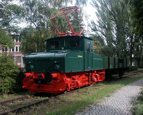 Westhafen: Im Schuppen stand die Nr. 11 und eine weitere Lok (vermutlich Krauss-Maffei). Vor dem Schuppen steht eine EL 4, die einst bei der Bullenbahn im Einsatz war und hier als Denkmal steht.