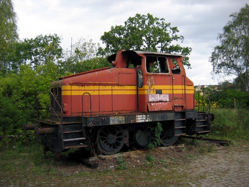 02.08.2004/ Am alten Bahnhof von Börnicke, an der stillgelegten Strecke von Nauen nach Kremmen, ist auf einem kurzen eingeschotterten Gleisjoch am Rande des Bahnhofsvorplatz eine Henschel DH 240 aufgestellt. Sie ist in rot mit orangen Zierstreifen lackiert. Das Fahrwerk und Rahmen sind schwarz. Es handelt sich um die Henschel 30314/61, welche vormals bei der Berliner Kraft und Licht AG (Bewag), Kraftwerk Reuter, in Berlin als DL1 im Einsatz war. Die Anschriften sind noch verblichen erkennbar. Zumindest im September 1988 gehörte sie noch zum Einsatzbestand des Kraftwerkes. Die letzte HU erfolgte lt. der Anschriften am 29.08.1984, die letzte Br.Unt. am 03.10.1989. Nach dem schlechten äußeren Zustand zu urteilen, ist die Maschine schon eine geraume Zeit im Freien abgestellt. Am Rahmen der Lok sind Kunststoffschilder von Gleismac Italiana SpA, Gazzo die Bagarello angebracht, die sehr ausgeblichen sind. Ob einmal ein Export der Maschine nach Italien geplant war, der sich zerschlagen hat? Sie wird wohl kaum zurück geholt worden sein. Eine Vorgängermaschine bei der Bewag (Bdh Krupp 2520/50) war bereits über NEWAG an Gleismac gelangt.
