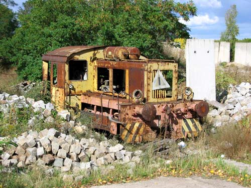 25.09.2004/ jm/ Das Anschlussgleis ist demontiert, der Lokschuppen ist leer. Auf dem Gelände des Betonwerks steht aber noch eine N4 herum, deren Dieselmotor durch einen Elektromotor ersetzt wurde. Sie diente zuletzt zum Verschub von Betonfertigteilen in einer Halle des Werkes.