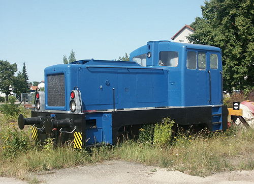 06.08.2003/ ms/ jm/ Rangiert wird nur noch morgens, die beiden Rangierlokomotiven waren schon im Schuppen verschwunden und konnten nicht näher untersucht werden. Vor der Verwaltung steht eine dritte V22B als Ersatzteilspender. Sie könnte Dank des guten äusserlichen Zustands aber auch als Denkmal hier stehen.