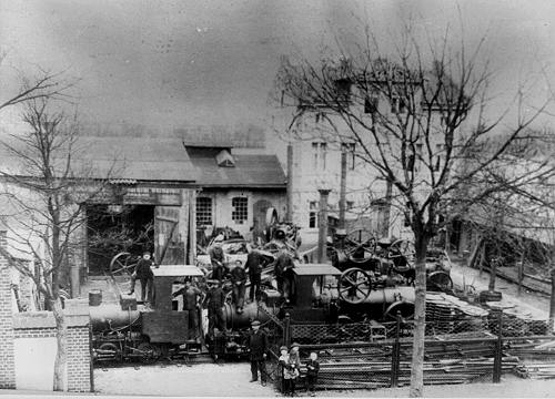 Otto Hoffmann: Oben ein Blick auf den Werkshof, auf dem neben diversen Dampfmaschinen auch zwei Krauss-Feldbahndampfloks zu sehen sind.