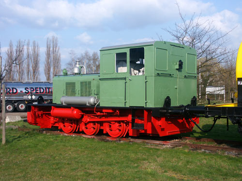 09.04.2004/ jm/ Vor dem Werk steht weiterhin, jederzeit gut fotografierbar, die einst hier eingesetzte dreiachsige Deutz-Rangierlokomotive mit einem Kesselwagen. Die Lok und der Wagen wurden offensichtlich erst vor kurzem wieder neu lackiert und so präsentiert sich diese in bestem Zustand.