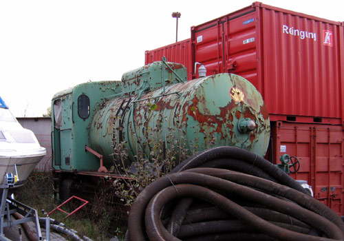 02.11.2005/ jm/ Die Shell-Dampfspeicherlok steht auf dem Hof und kann zumindest hier nicht als Denkmal bezeichnet werden (obwohl der Zustand, hier die Vollständigkeit der Maschine, sehr gut ist), die Lok wurde hier eher nur zwischengelagert und sollte mal als Denkmal in Schönberg bei Kiel (VVM) aufgestellt werden. Diese Pläne zerschlugen sich aber, da keine Genehmigung zur Aufstellung als Denkmal zu erhalten war (u.a. Gefahr für spielende Kinder, die von der Lok fallen). Deshalb steht die Lok jetzt wieder zum Verkauf.