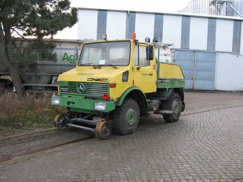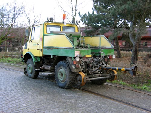 06.11.2005/ 22.12.2005/ jm/ 26.05.2006/ jm/ 15.07.2006/ jm/ Vorhanden ist ein gelber Zweiwege-Unimog. Er ist von der Straße aus gut zu sehen, das Licht steht hier aber nur früh morgens günstig. Die Zweiwege-Einrichtung stammt von Zweiweg-Schneider, ein Fabrikschild wurde aber nicht gefunden.