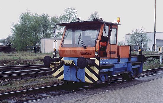 21.04.1999/ jm/ Hier werden leere Container gelagert und bereitgestellt. Auch über die Bundesbahn werden Wagen zugestellt, die dann von der minilok rangiert werden. Diese straßengängige Lok ist, da keine Umsetzmöglichkeiten bestehen, notwendig, hat allerdings auf nassen Schienen oft Schwierigkeiten.