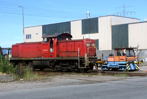Auf den Gleisen zwischen den beiden Containerlagern steht ein Reisezugwagen von DampfPlus, 61 50 89-25 012-5 "Salon". Die DB 295 025-1 schob einen leeren Containerzug herein und holte einen anderen ab, dabei ergab sich ein interessanter Größenvergleich zwischen einer DB V90 und eine minilok.