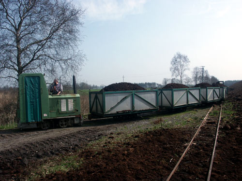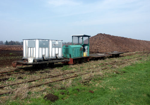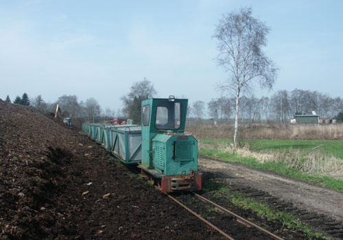 Die Feldbahn wird lt. Personal noch eingesetzt und der Torf hier dann auf LKW verladen, die zum Werk Drochternsen (Aschornermoor) fahren. Eine einst geplante Schienenverbindung zu diesem Werk kam nicht zur stande.