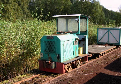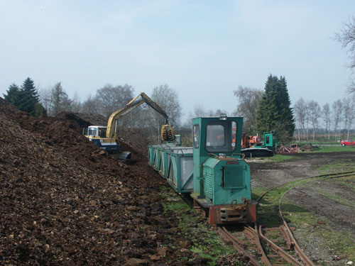 Torfwerk Wolfsbruchermoor: Lok Nr. 8 beim Bagger, rechts das Gleis zur Entladanlage. (Foto: 25.04.2006, Jens Merte)