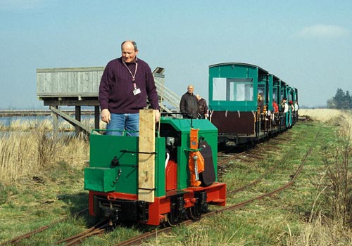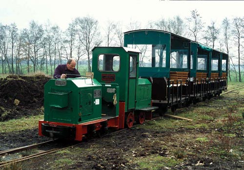 16.04.2006/ mw/ Die Moorbahn liegt auf dem ehemaligen Gelände des Torf- und Humuswerk Süderleda und weist einen Moorkurs von etwa 5,6 km Länge auf. Sie wurde im Frühjahr 2005 eröffnet. Neben den zwei Lokomotiven sind etwa zehn 2004 erbaute offene, jedoch mit Dach versehene zweiachsige "Reisezugwagen" vorhanden.