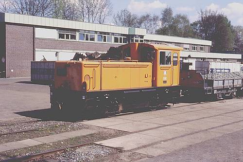 20.04.1999/ jm/ Hier erhielten wir erst die Foto-Erlaubnis und dann auch noch eine kleine Führung. Die beiden alten Deutz-Lokomotiven sind zur Zeit in der Werkstatt. Von den Gmeinder/SSW-Akku-Lokomotiven sind sieben Stück (Betriebsnummern "010" - "016") vorhanden. Folgende Fahrzeuge wurden angetroffen: