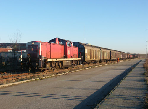 18.12.2003/ jm/ gr/ Eigentlich soll hier die Ecotrans Hanserail aus Bad Oldesloe rangieren, angetroffen wurde aber die DB 295 063-2 (Deutz 58127), die gerade dabei war, sich mit einem recht langen Zug auf den Weg Richtung Lübeck zu verabschieden. Da es sich bei Ecotrans Hanserail um eine Art Bahnspedition handelt, die stets Dritte beauftragt, kann es sich daher bei dem Zug aber auch um eine von Ecotrans Hanserail organisierte Fahrt gehandelt haben. Es gibt also tatsächlich hier auf dem Restgleis des einstigen Hüttenwerkes nach langen Jahren wieder Bahnverkehr. Die Strecke war Stellenweise - besonders im Einschnitt mit der Straßenbrücke vor dem ehemaligen Werkstor - schon sehr zugewachsen, ist aber jetzt wieder freigeschnitten. Bedient wird wohl nur der Schrotthandel Borwski und Hopp. Das weiterführende Gleis mit einem ordentlichen Gefälle hinunter zur Trave, hier ist eine weitere Verladeanlage von Lehmann, ist schon lange nicht mehr befahren worden und zugewachsen.