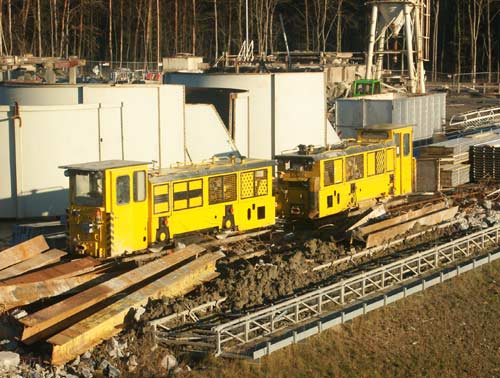 22. + 23.06.2003/ jm/ Da die erste Röhre fertig ist, haben die Schöma´s derzeit "Tageslichturlaub" bis zum nächsten Einsatz, wenn die zweite Röhre gebohrt wird. Derzeit stehen deshalb auch zwei gelbe Schöma neben der Diema und der SIG auf dem nördlichen Betriebshof. Diese sind gut sichtbar von der Straße, die derzeit quer durch die Baustelle verläuft.