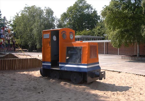 .10.1989/ 06.09.2004/ ao/ Bei der Schule steht eine Lok. Der Lokaufbau wurde in den Farben der Kieler Hafenbahnloks komplett neu gemalt, d.h. Orange mit weißem und blauem Zierstreifen. Getriebe und Motor sind auch noch vorhanden, der Motor kann durch zwei Plexiglasscheiben betrachtet werden. Schilder des Herstellers SCHÖMA sind auch noch dran.