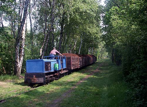 01.06.2004/ jm/ Die Feldbahn für den Torftransport vom Moor zum Werk ist weiterhin im Einsatz. Im Gegensatz zum Besuch 1999 wird jetzt eine andere, noch weiter vom Werk entfernte Abbaustrecke ins Moor benutzt. Im Einsatz wurde das Gmeinder-Doppel und die gelb-rote Nr. 3.3 (welches eine Vorkriegs-O&K sein dürfte) angetroffen. Die Gmeinder machte sich gerade mit einem beladenen Zug auf den Weg zum Werk. An der Verladeanlage im Werk werden die Wagen mit einer Art Seilwinde befördert, so dass hier keine Lok zu finden ist. Nachdem die Lok die beladenen Wagen an der Verladung abgestellt hatte, ging es mit leeren Wagen wieder ins Moor.