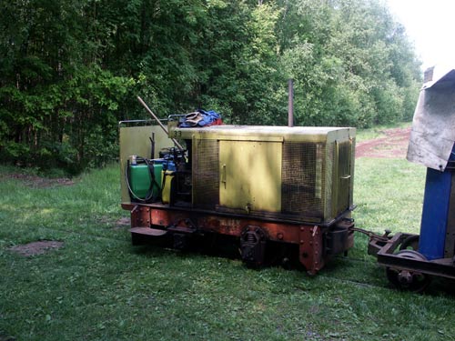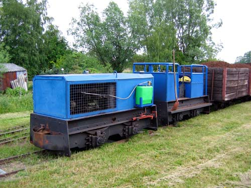 Im wenige hundert Meter entfernten Torfwerk befand sich noch eine weitere Lok. Hauptsächlich in Betrieb sind noch nicht allzu alte Loren mit Holzaufbau, die einen sehr soliden Eindruck machen. Weitere, ältere Loren stehen etwas abseits. In einem Teil der Werksanlagen ist eine wiederum in privatem Besitz befindliche, auseinandergenommene Diema-Lok abgestellt, die sehr auffällig als Lok 7 beschriftet ist.