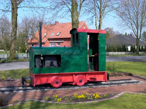 09.04.2004/ pz/ Auf dem Dorfplatz wurde 2001 eine Feldbahn-Diesellok als Denkmal aufgestellt. Weitere Angaben fehlen. Auf den Rädern findet sich die Bezeichnung DS 30. Der Motor stammt von Mercedes Benz und trägt die Nummer: 94594/1934. Diese Motornummer ist aber nicht in der Diema-Liste zu finden (da gibt es z.B. 94544 = FNr. 774, 94590 = FNr. 827, 94591 = FNr. 828)