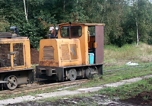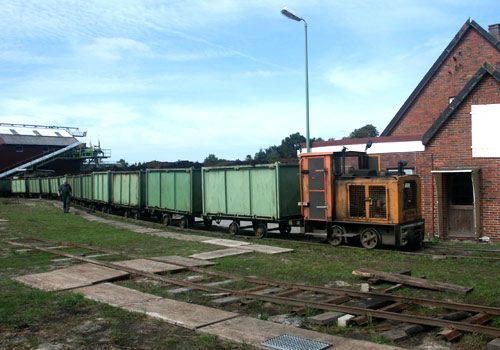 13.09.2005/ jm/ Das Werk liegt am Küstenkanal, heute wurde nasser Torf für die Pilzzucht auf ein Schiff in die Niederlande verladen. Die Feldbahn führt in Richtung Süden aus dem Werk durch den Wald zum Moorgebiet. Im Werk wurde die Lok Nr. 21 in der Werkstatt abgestellt vorgefunden. Neben den Gleisen stand die grüne Diema FNr. 2329 abgestellt. Im Einsatz war Lok Nr. 7 und Nr. 17 (bei der kein Fabrikschild gefunden wurde) zusammen, da der nasse Torf sehr schwer ist. Allerdings kam die Nr. 7 dann kurzfristig vor einem verkürzten Zug allein zum Einsatz, da einige Wagen im Moor entgleist waren.