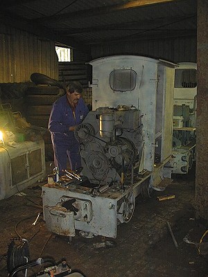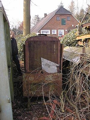20.04.2002/ dr/ Hier konnte die Schöma FNr. 201 aufgestöbert werden. Der einst eingebaute Schömag- bzw. MWM-Motor ist nicht mehr drin. Aber der original Kühler liegt noch bei. Die Maschine ist seit vielen Jahren im Freien abgestellt. Es sind noch zwei weitere Lokomotiven aus dem Hause Schöma vorhanden, die im Trockenen stehen. Schienen und Torfwagenrahmen sind auch in Massen aufgestapelt.