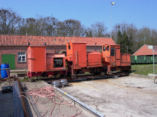 15.04.2004/ pz/ Das Torfwerk ist weiterhin in Betrieb, Anscheinend wurde es jedoch von Griendtsveen übernommen, da es unter diesem Namen nunmehr firmiert. Der Transport wird mit der Feldbahn abgewickelt. Insgesamt sind 8 Loks vorhanden. 3 Loks wurden am Besuchstag repariert. Sie standen aufgebockt ohne Räder vor der Werkstatt (Lok 8 – 3 – 4).