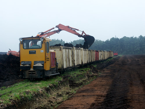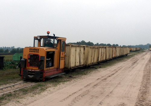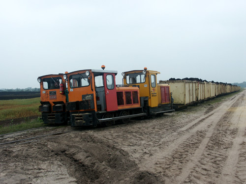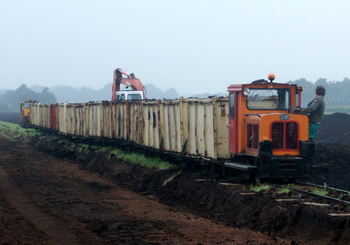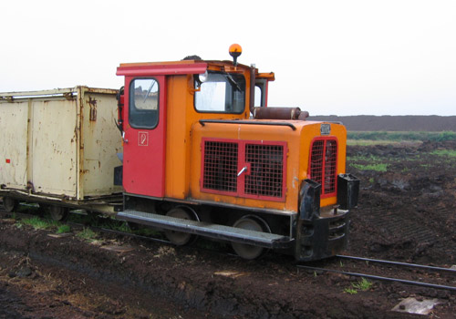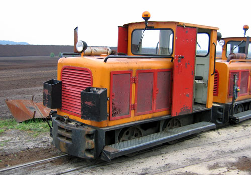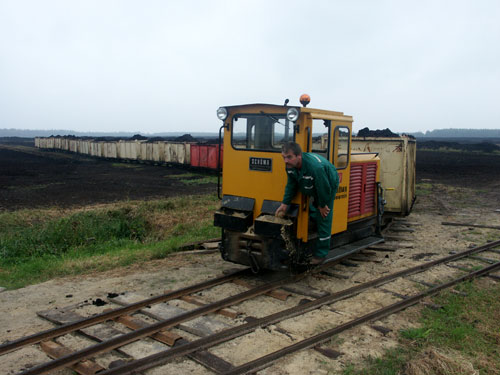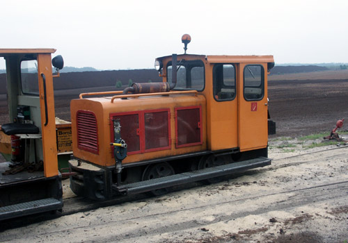14.09.2005/ jm/ Heute herschte an der Verladung "Ost" an der B 401 reger Betrieb, verladen wurde relativ nasser Torf, welcher für die Pilzzucht (Champignions) benötigt wird. Verladen wird hier auf LKW, welche dann zur Schiffsverladung am Küstenkanal fahren. Von hier gelangt der Torf dann mittels Schiff in die Niederlande. In Doppeltraktion brachte 16/6902 und 21/6907 einen solchen, durch den feuchten Torf schweren Zug zur Verladeanlage an der B 401. Bei der Verladung gibt es eine Wendeschleife, die beladenen Züge aus dem Moor fahren über diese an die Verladeanlage, hängen die beladenen Wagen ab und kuppel die leeren Wagen an. Der leere Zug umfährt die Verladung und durchfährt die Wendeschleife in entgegengesetzter Richtung und gelangt so wieder zum Moor. Bei der Verladung wurden ausserdem angetroffen: 31/6917, 19/6905 und die Diema FNr. 2234.