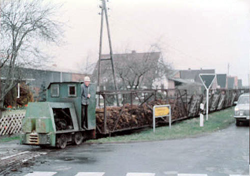Meyer: Schöma FNr. 746/1944, Typ Gas BB/FF, Mitte der 1970er aufgenommen. Die Lok steht vor der Hauptstrasse in Sedelsberg gegenüber dem damaligen Torfwerk Meyer. (Foto: Sammlung Dieter Hinrichs)