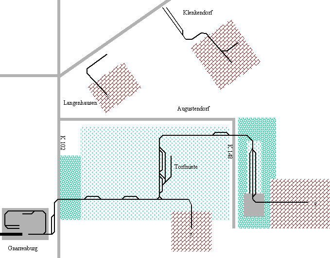 Torfwerk Friedrich Meiners: Schematische, nicht maßstäbliche Übersicht über die Feldbahn in Gnarrenburg.