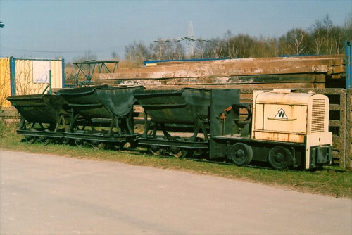 04.12.1994/ uv/ Vor dem Werksplatz der Bauunternehmung wurde anläßlich eines Jubiläums (offenbar schon vor einigen Jahren) eine Schöma-Lok zusammen mit drei Loren aufgestellt.