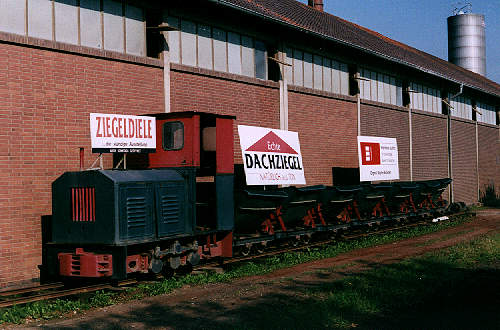 24.07.2001/ uv/ Unverändert stehen die beiden Denkmalloks dort in recht gutem (LKM 248923, Spur 700 mm) bzw. inzwischen nahezu schrottreifem (Diema 2648, Spur 600 mm) Zustand. Letztere läßt sich inzwischen kaum noch fotografieren. Das Ziegelwerk befindet sich am nördlichen Ende der gerade in Bau befindlichen Umgehungsstraße für Dreye.
