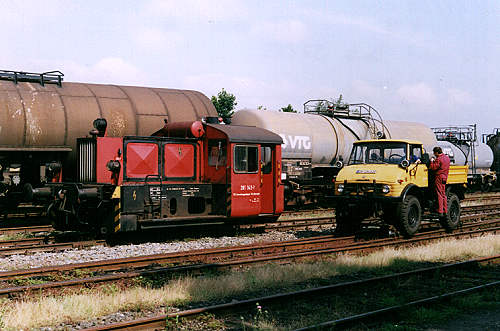06.08.1997/ UV/ Das Kesselwagendepot liegt rund 2.5-3 km südlich vom DB-Bahnhof. Ende der 80er Jahre entstand eine Reparaturhalle, in der kleinere, nicht abnahmepflichtige Arbeiten ausgeführt werden. Ansonsten sind auf den umliegenden Gleisanlagen hunderte der unterschiedlichsten Kesselwagen abgestellt. Die einzige Betriebslok war gerade mit einem Getriebeschaden in Reparatur.