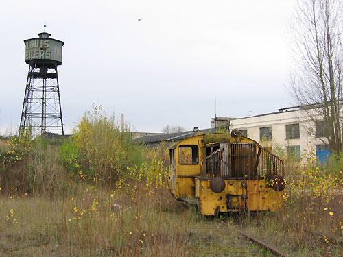 03.08.2003/ ms/ jm/ Louis Eilers selbst gibt es wohl nicht mehr, auf dem Gelände sind andere Firmen ansässig, u.a. die Firma Warnholz. An Eilers erinnert aber noch ein großer Wasserturm mir dem Louis Eilers-Schriftzug und eine Köf II, die hier wohl vergessen wurde. Es handelt sich laut Anschrift um die ehem. DB 323 976-1.