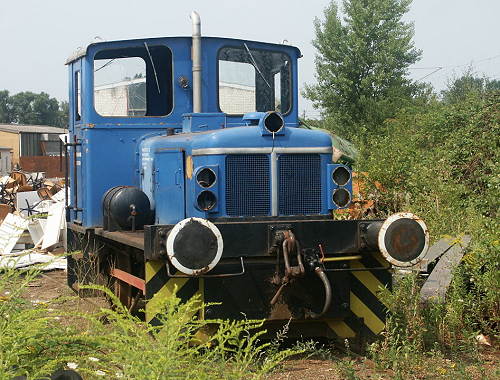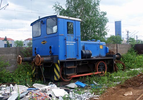 03.08.2003/ ms/ jm/ Der Schrotthandel hat einen Gleisanschluss Richtung Bahnhof Messe/Latzen. Hier steht eine blaue Deutz-Rangierlok, die noch die Beschriftung des Vorbesitzers (Zuckerverbund Nord AG, Werk Rethen) trägt. So ganz "fit" sieht die Lok nicht mehr aus.