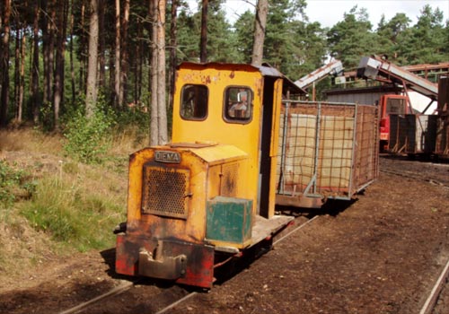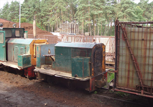 02.08.2005/ ls/ Auf den Gleisen der Feldbahn herrschte heute Betrieb. Bis auf Diema 1916, die in der Entladehalle abgestellt war, waren alle Lokomotiven im Einsatz. Der Zug wird je nach Bedarf mit bis zu 50 Torfwagen gefahren. Bei mehr als 50 Wagen reißen lt. Mitarbeiter die Kuppelketten, aufgrund des starken Gefälles.