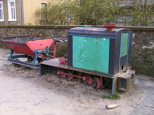 12.04.2001/ jm/ Auf dem Schulhof steht eine bereits etwas "abgespielte" Deutz-Feldbahndiesellok zusammen mit einer Feldbahnlore. Schilder oder andere Erkennungsmerkmale wurden nicht gefunden, es soll sich aber um folgende Maschine handeln: