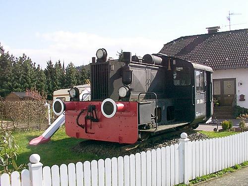 12.04.2001/ jm/ Hier hat sich jemand eine ehemalige DR-Köf in den Vorgarten gestellt. Angeschrieben ist noch die letzte Loknummer 310 280, gebaut wurde die Maschine 1934 bei O&K unter der Fabriknummer 20274.