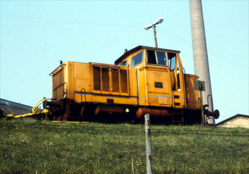 12.07.2004-info/ jm/ 03.09.2007/ jm/ Die Lok Nr. 2 (MaK FNr. FNr. 500063/1973 lt. Schild) begann um 15:20 Uhr damit, Wagen vom oberen Werk in den Bahnhof zu bringen. Dabei kann man die Übergaben am Bahnübergang und im Bahnhof sehr gut fotografieren. Am unteren Werk zog die Lok Nr. 6 (Krauss-Maffei Typ ML 500 C mit CAT-Motor, nächste ZU 24.04.2010 - ggf. FNr. 18722/1961) einen langen Zug aus dem Werk Richtung Heimboldshausen. Im unteren Werk wurde des weiteren der Windhoff-Teletrac Nr. 3 (Typ RW 110 DH FNr. 260172 lt. Anschrift - der ist bisher nicht bekannt gewesen!). Ausserdem stand im oberen Werk ein Klv 53 mit der ehemaligen Nummer 53 0638, nächste HU 03.03.2010, welcher zu K+S gehört.